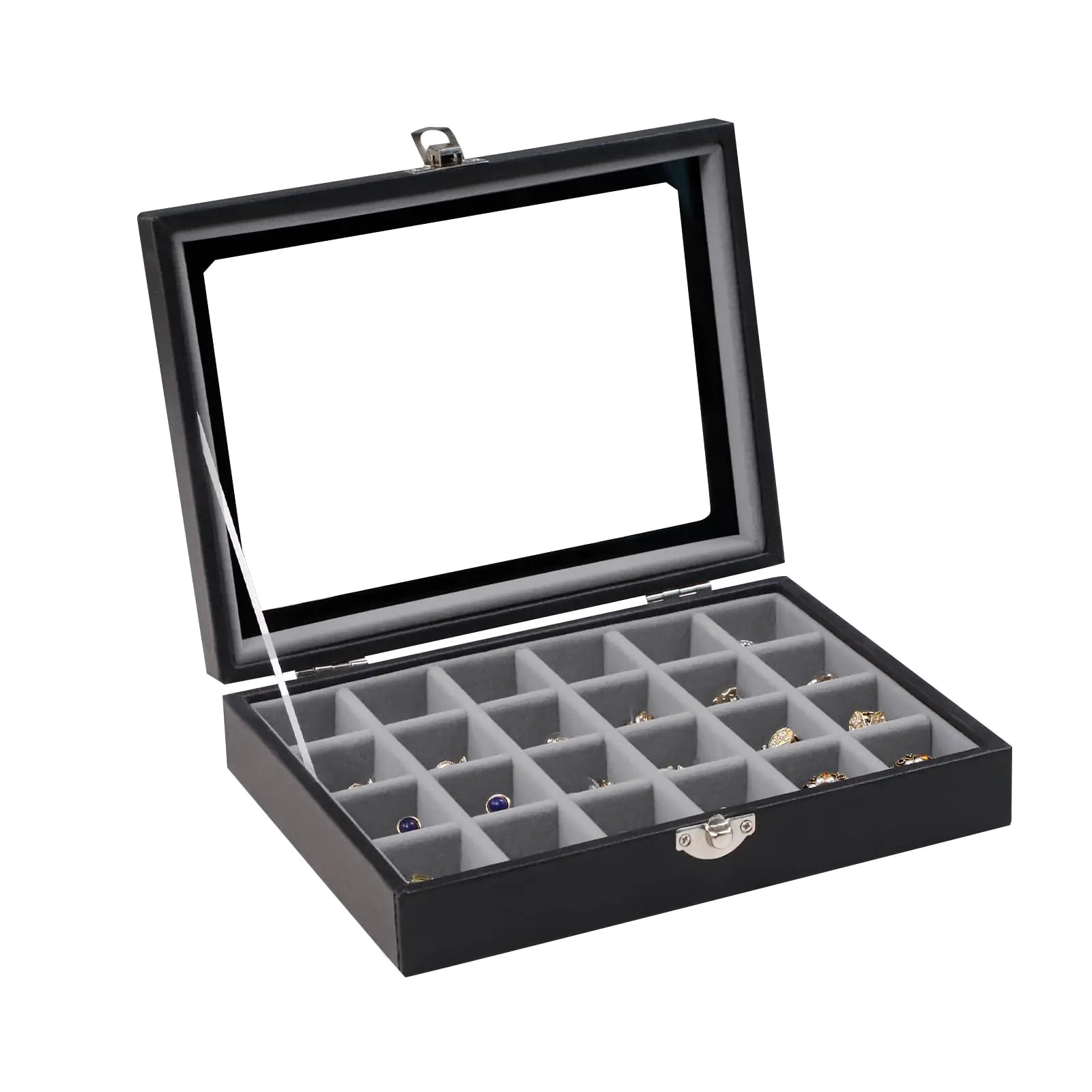 Wudygirl Small Jewelry Organizer Ring Box Velvet Jewelry Box Earring Organizer with Clear Lid Jewelry Tray for Women Girls Jewelry Display Case Drawer Inserts 24 Grid (Gray)